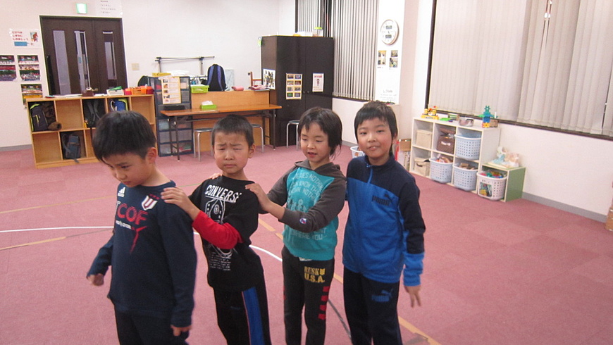 ジャンケンに負けた人は、ジャンケンに勝った人の後ろにつき肩に両手をかけ列を長くしていきます