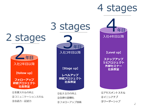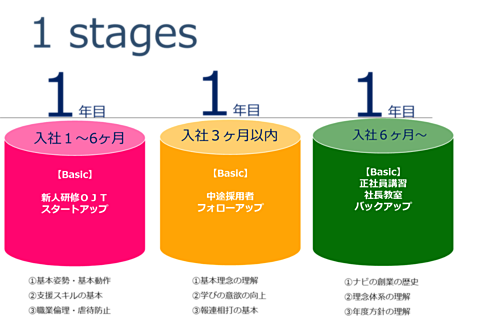 具体的には、社会経験の有無(新卒か既卒)や、naviでの勤続年数から4つのステージを設定し、それぞれのステージあわせた研修を企画していきます。