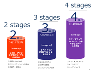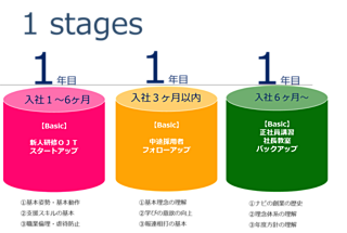 具体的には、社会経験の有無(新卒か既卒)や、naviでの勤続年数から4つのステージを設定し、それぞれのステージあわせた研修を企画していきます。